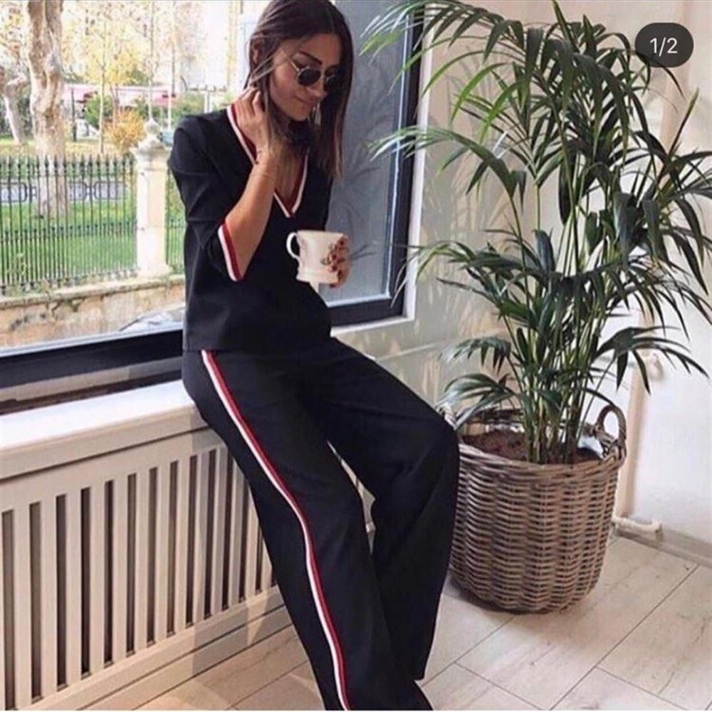 V Yaka Şerit Detay Takım SİYAH