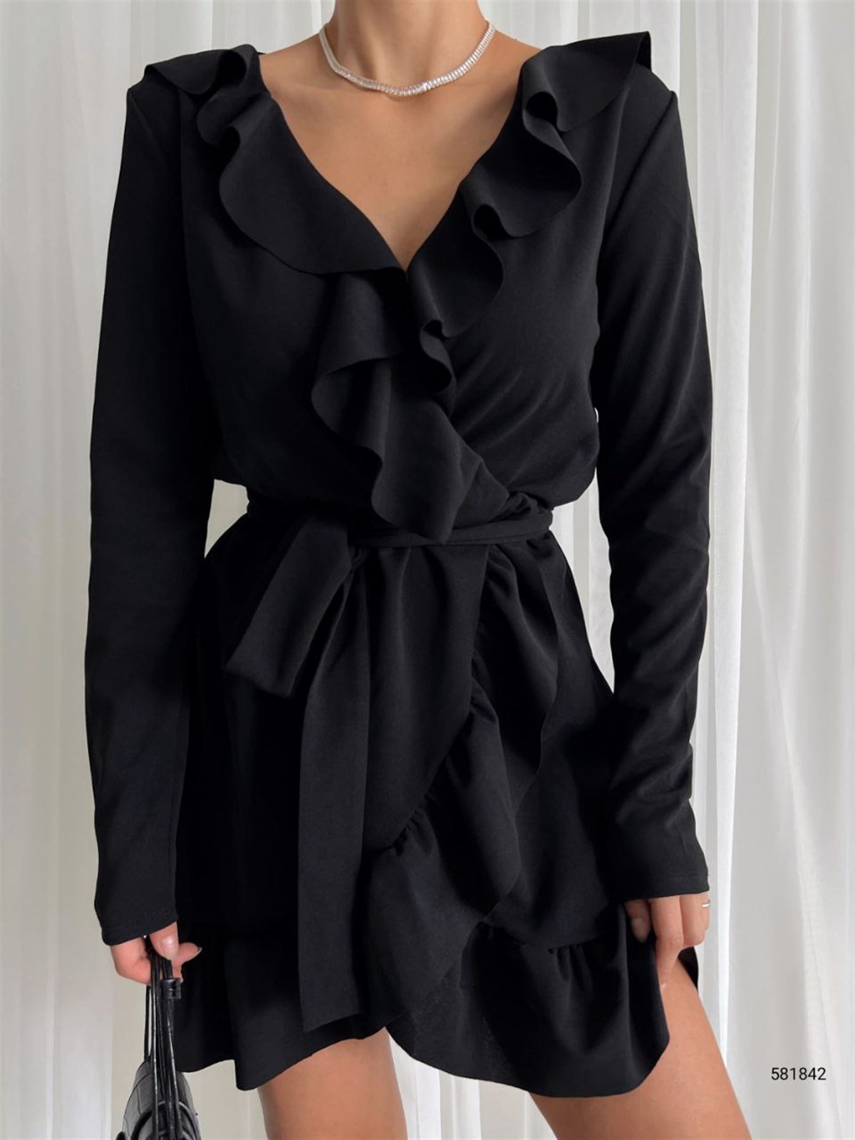 Amore Fırfır Yaka Kuşaklı Elbise 581842 SİYAH