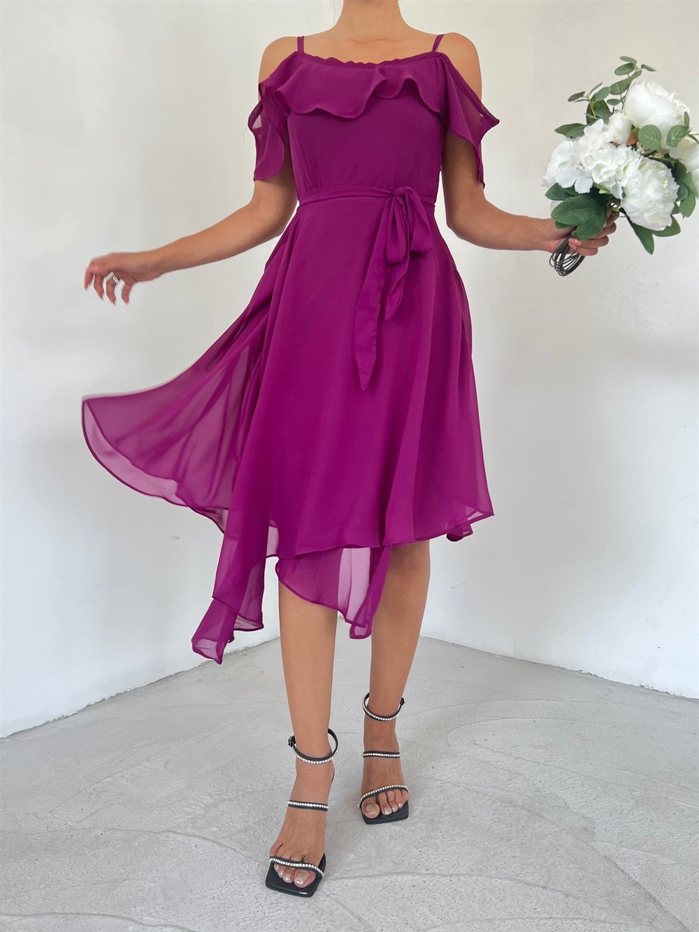 Asimetrik Kesim Volanlı Şifon Elbise MÜRDÜM