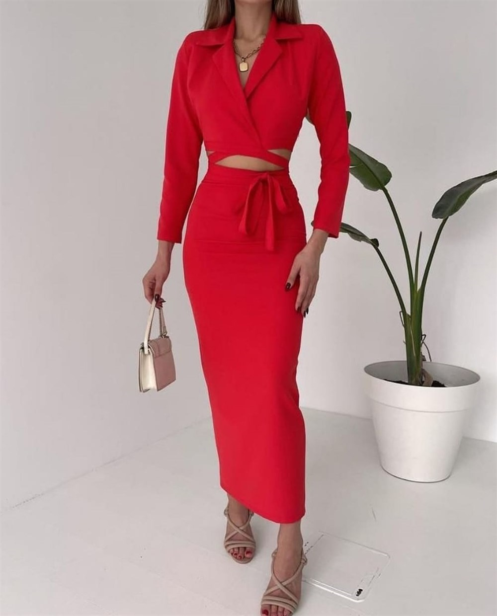 Bağlamalı Ceket Etek Takım- 6621 KIRMIZI