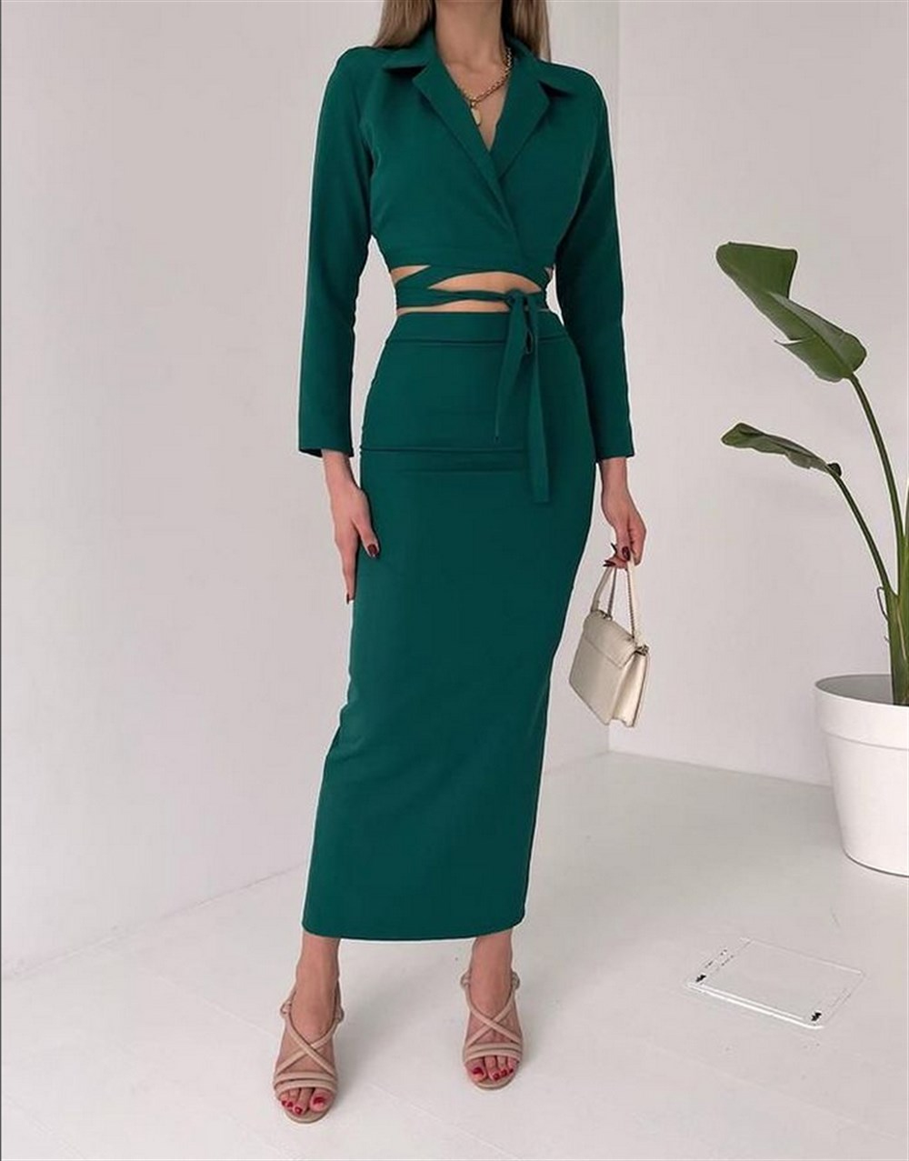 Bağlamalı Ceket Etek Takım- 6621 ZÜMRÜT YEŞİLİ
