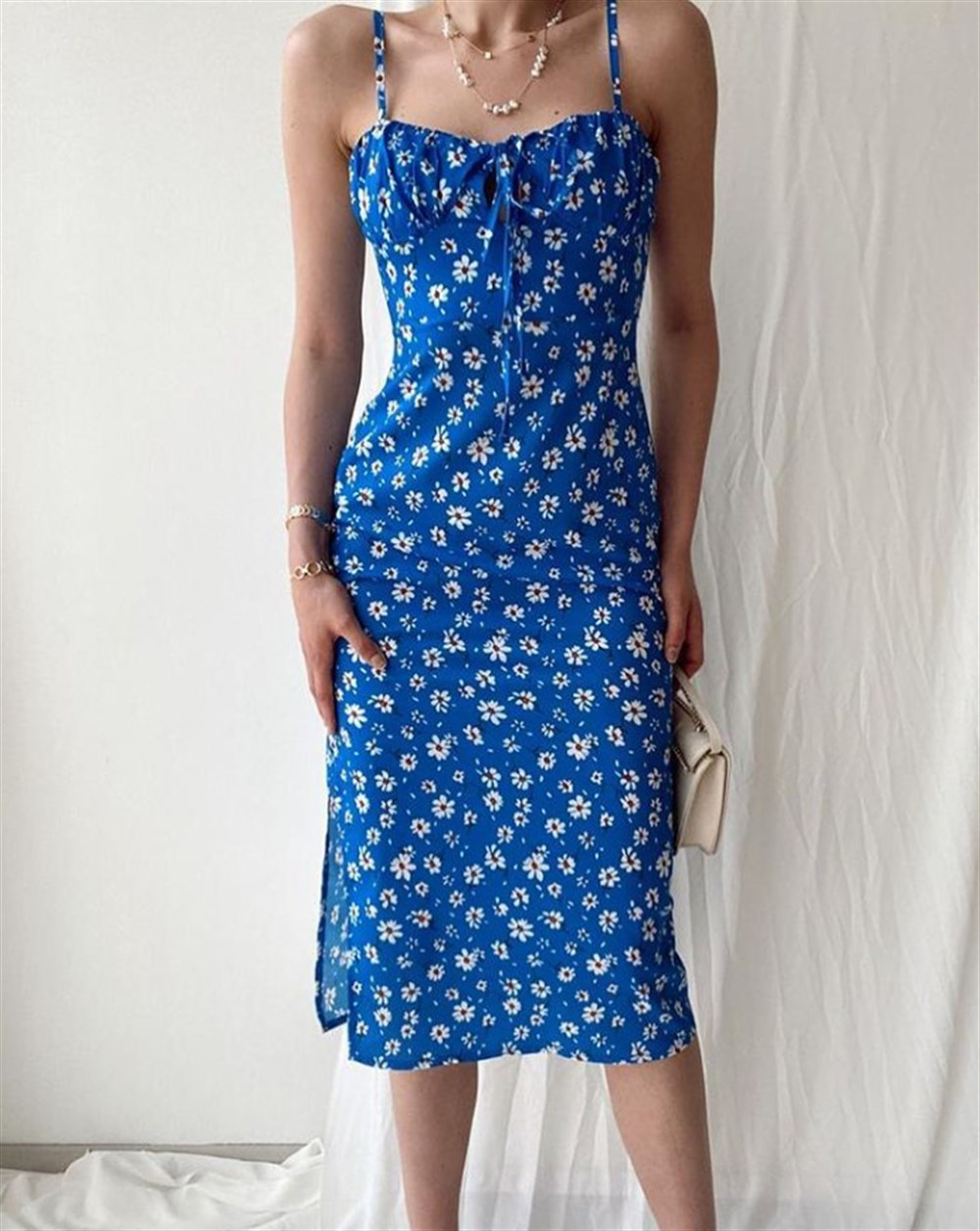 Beyaz Çiçekli Mavi Elbise MAVİ