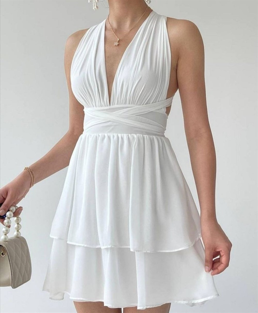 Boyun Bağlamalı Katlı Şifon Elbise 4180 BEYAZ