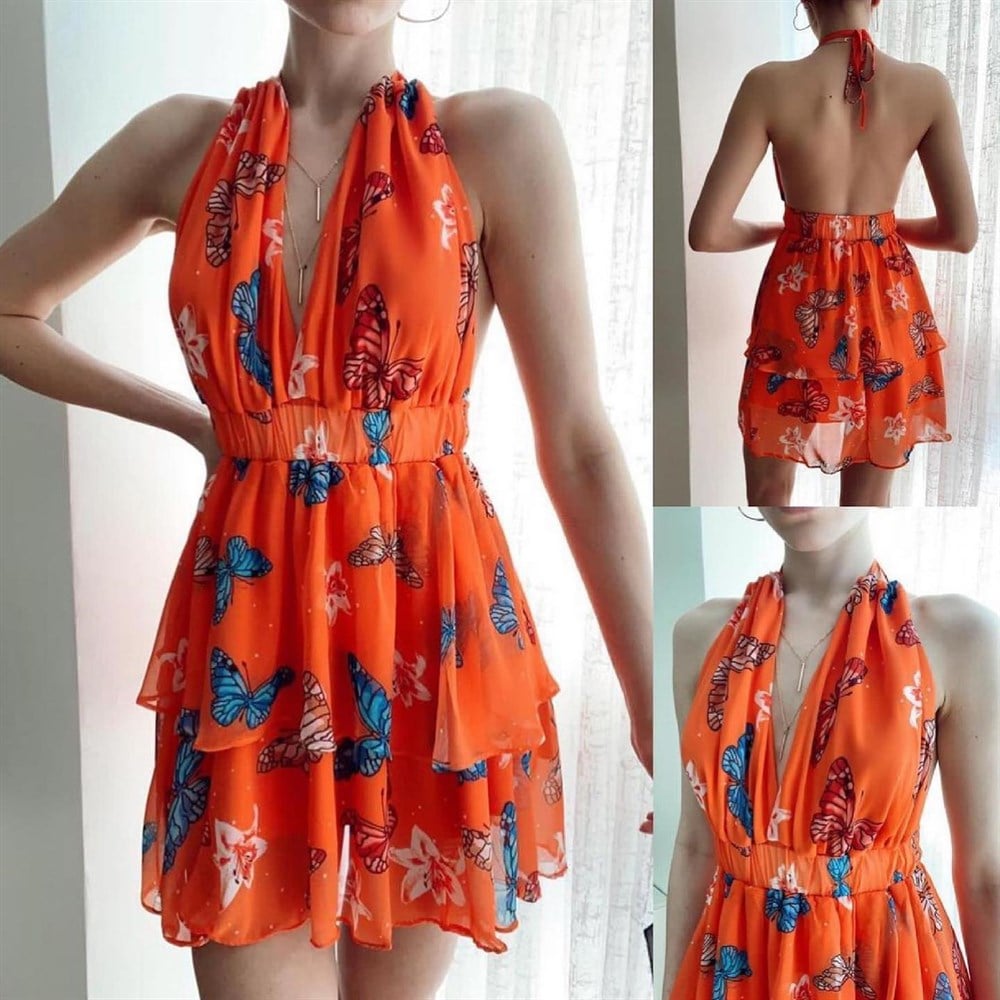 Boyun Bağlamalı Kelebek Desen Elbise TURUNCU