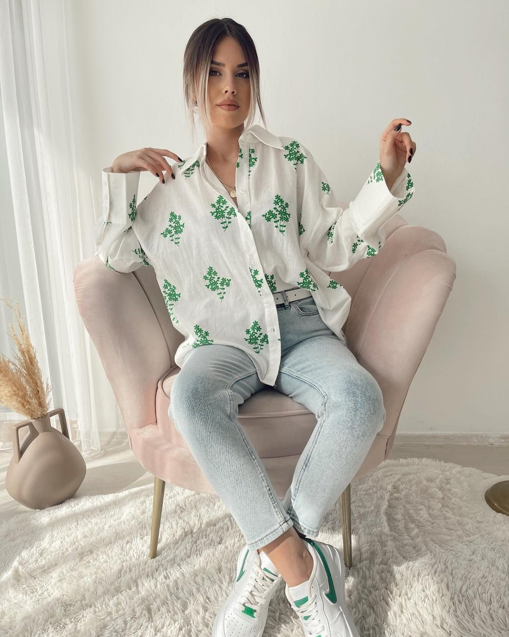 Çiçek Baskı Gömlek -4516 YEŞİL