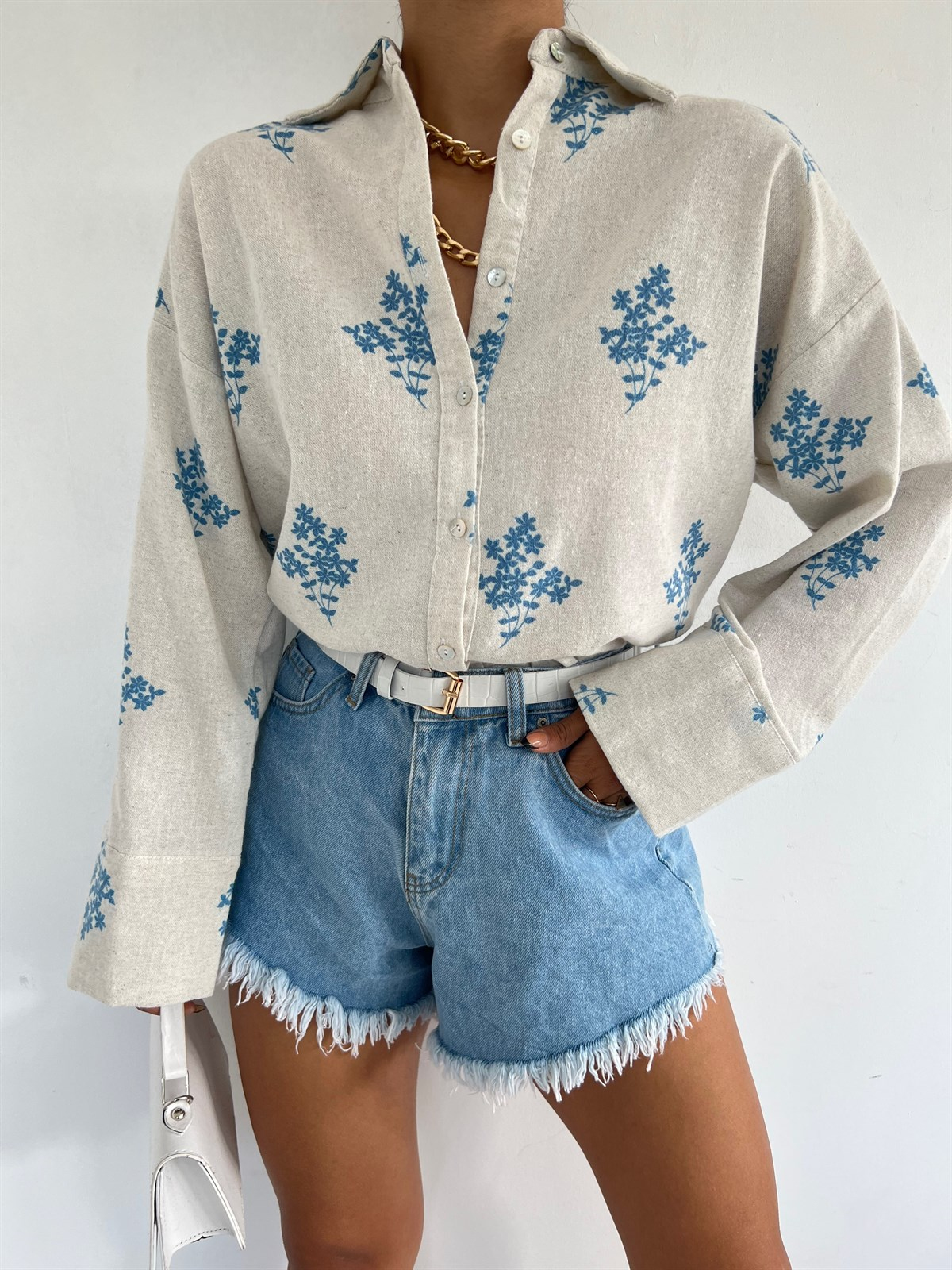 Çiçek Baskı Keten Gömlek 4706 MAVİ