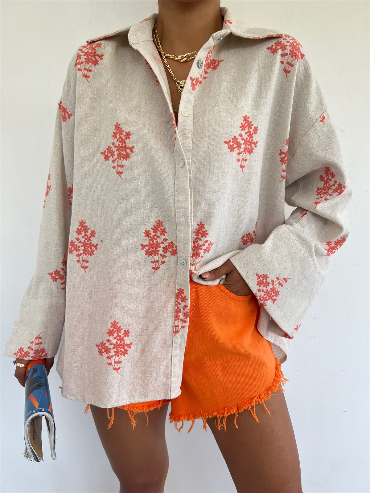 Çiçek Baskı Keten Gömlek 4706 TURUNCU XX