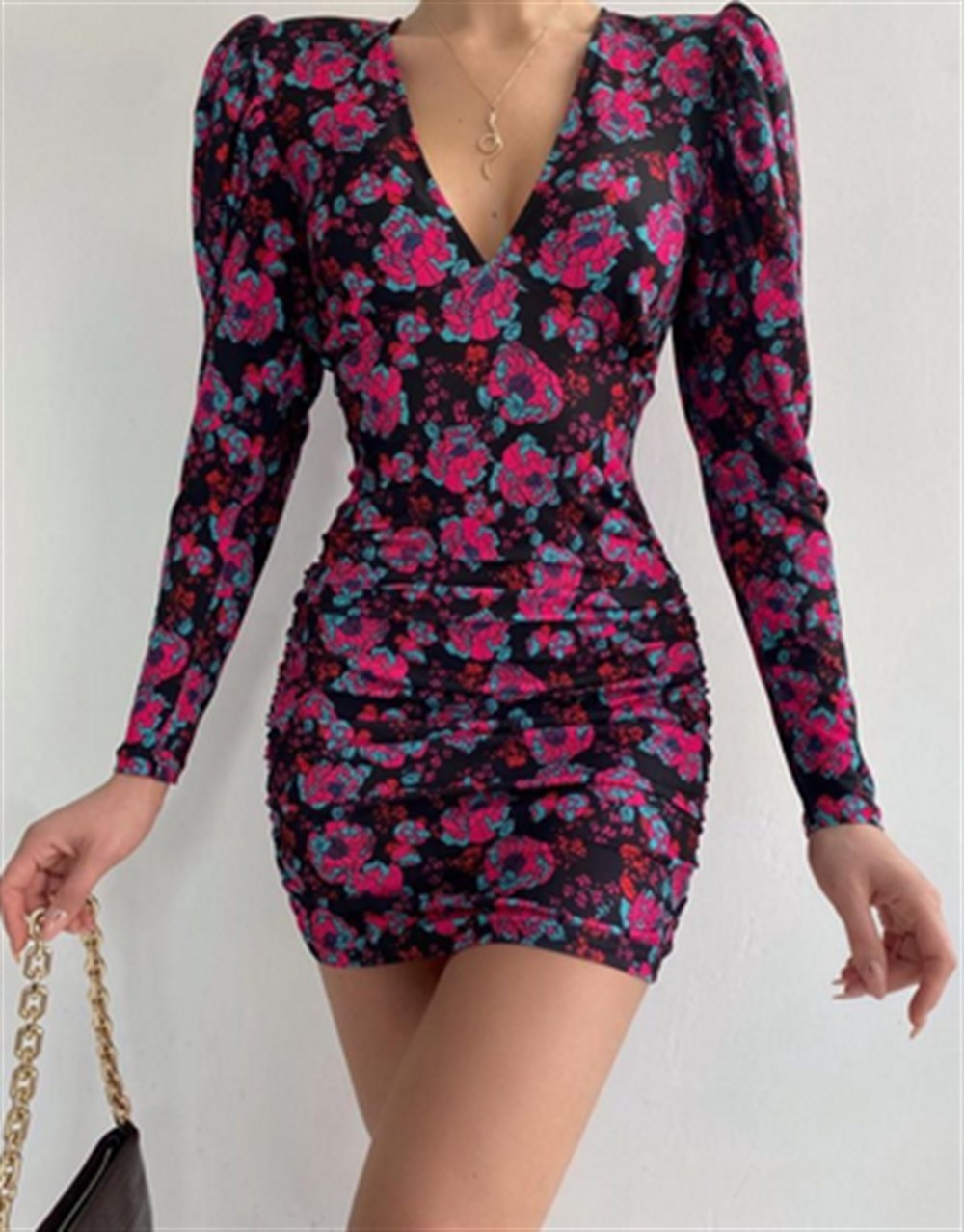 Çiçek Desen Vatkalı V Yaka Elbise- 6657