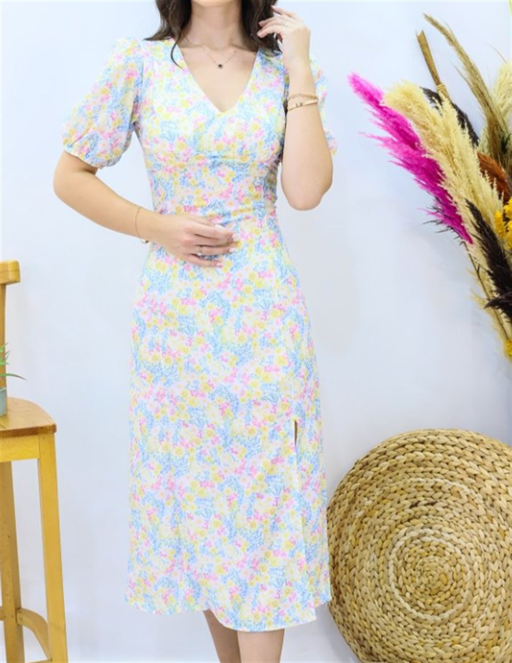 Çiçekli Kol Lastikli Midi Elbise-6531