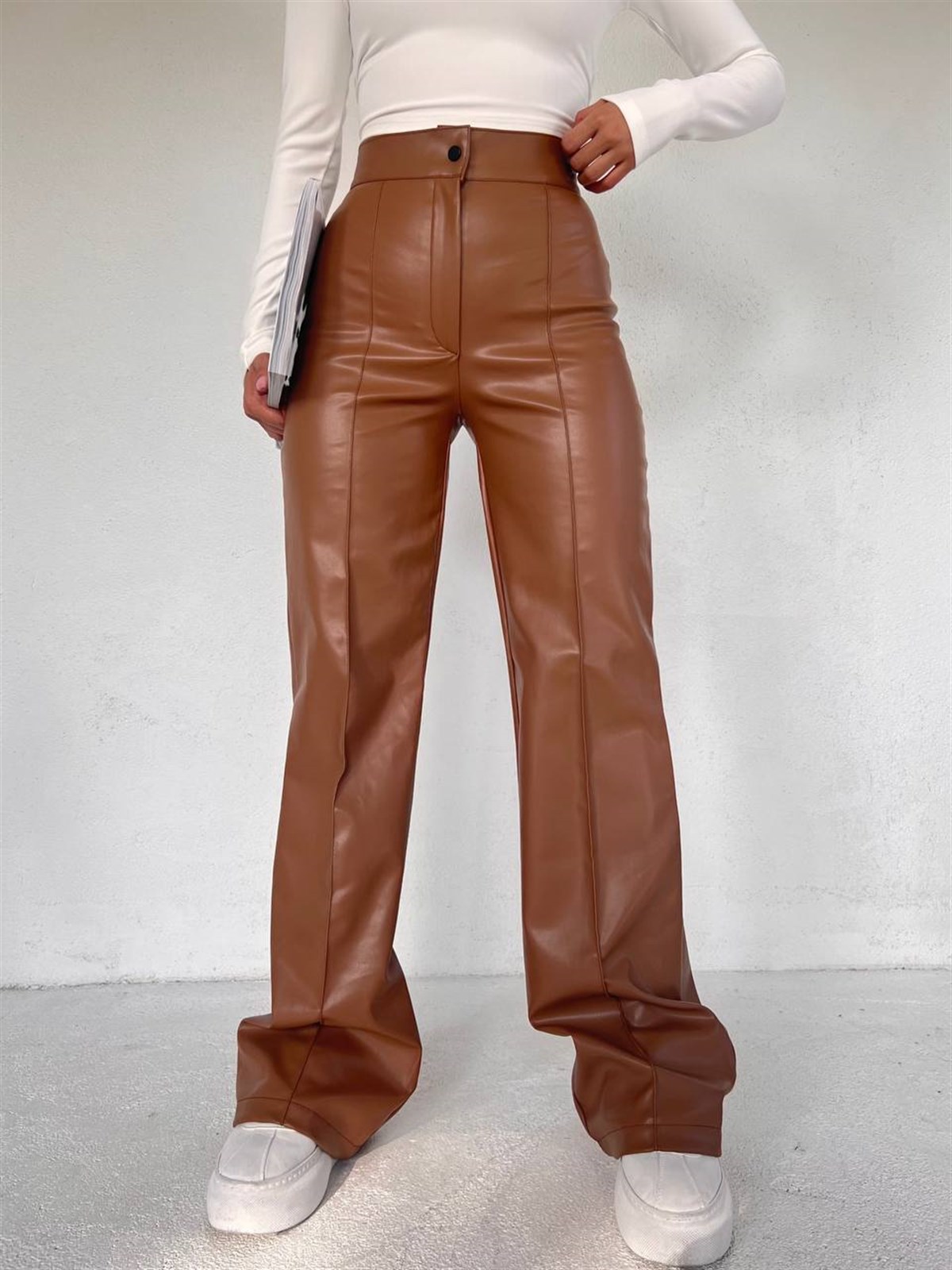 Cimalı Bol Paça Deri Pantolon 10010 KAHVERENGİ xx