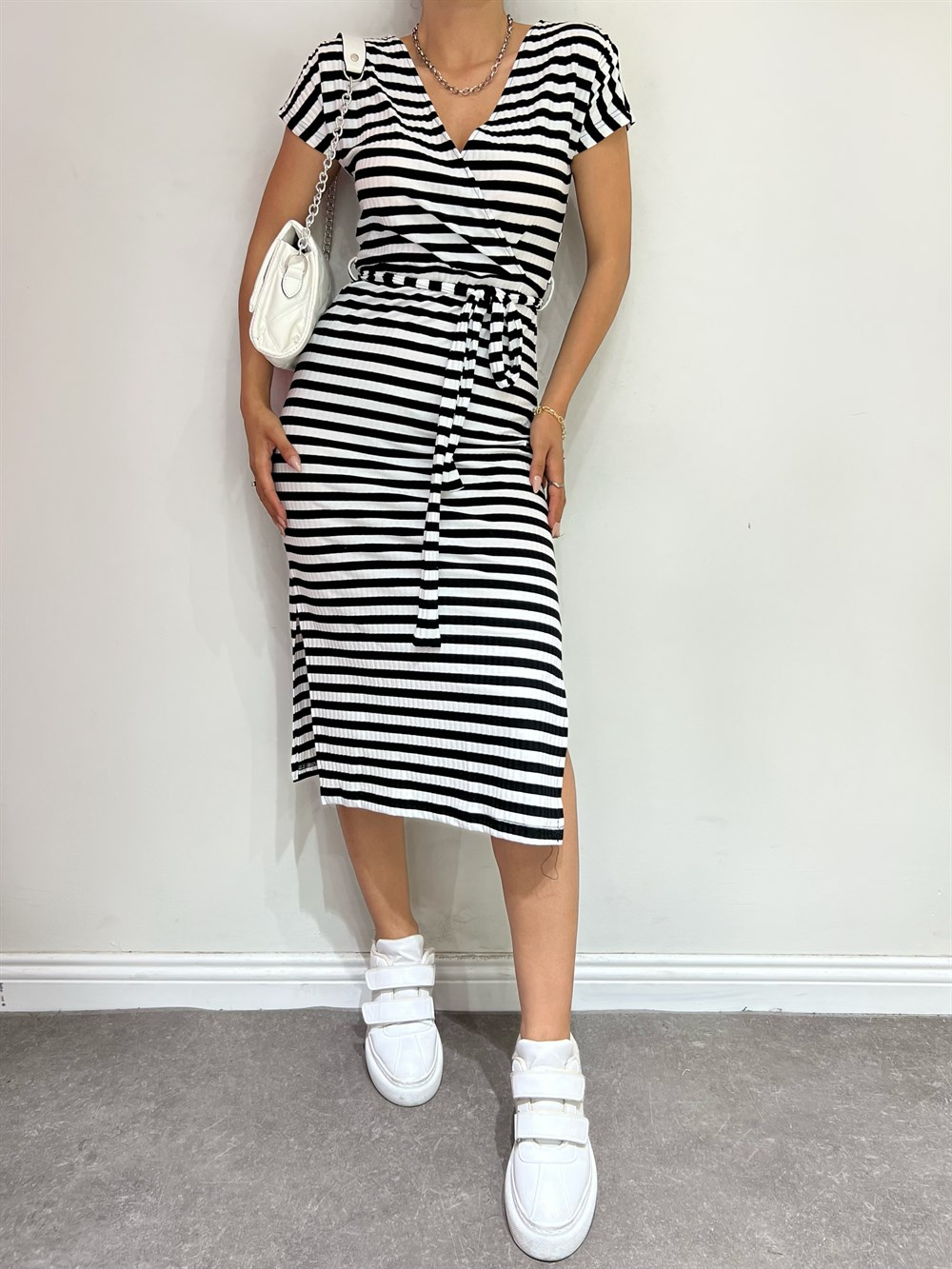 Çizgili Yırtmaçlı Kaşkorse Elbise 2310
