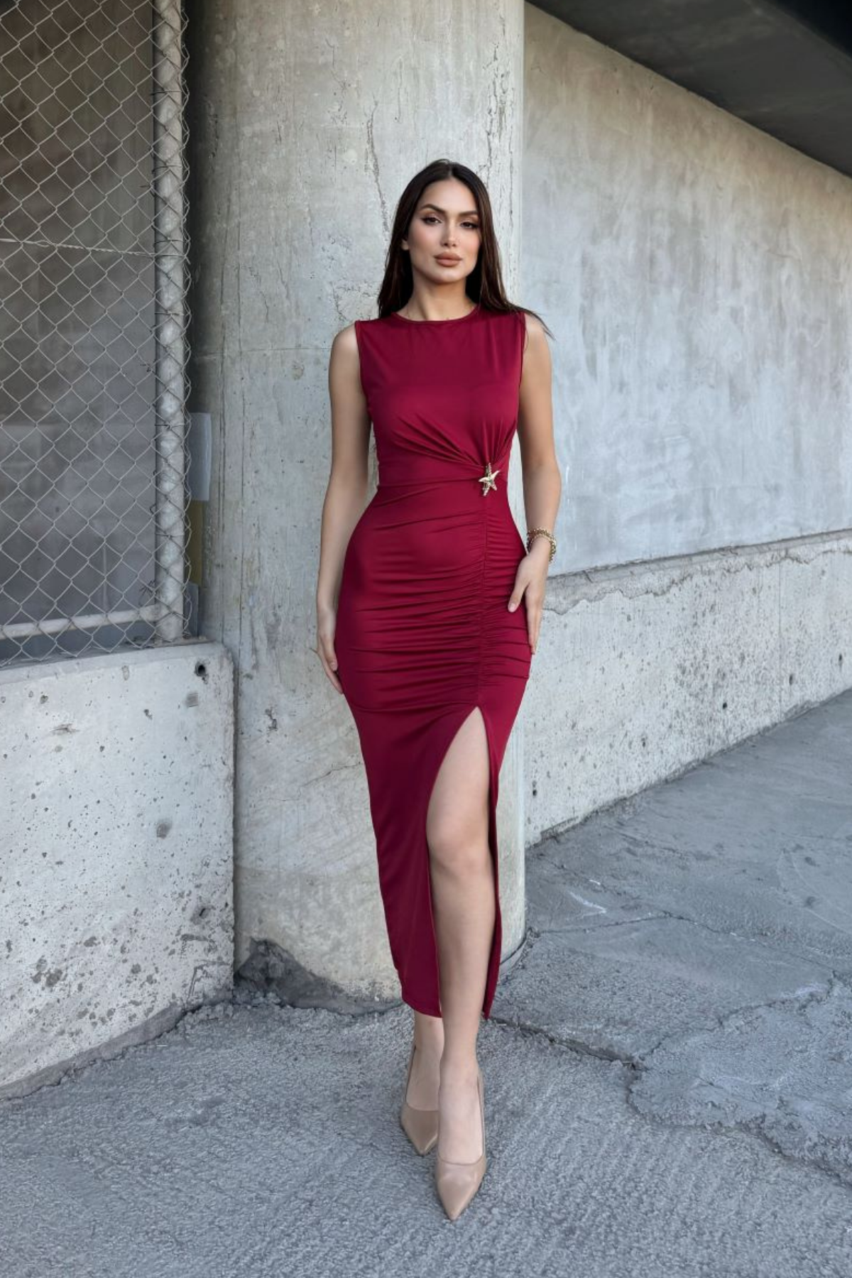 Deniz Toka Detay Büzgülü Midi Elbise 13606 BORDO