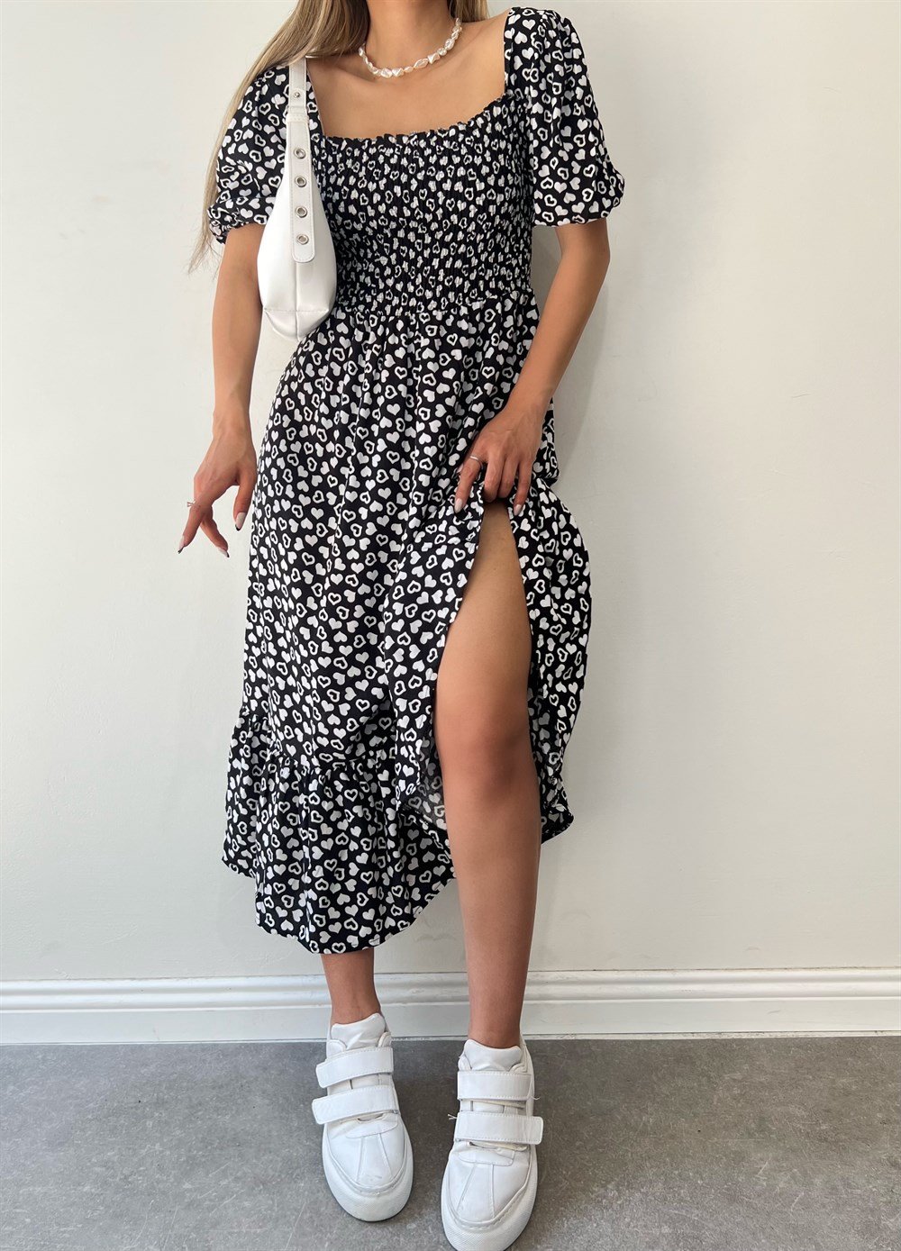Desenli Gipeli Karpuz Kol Elbise 6703 SİYAH-BEYAZ