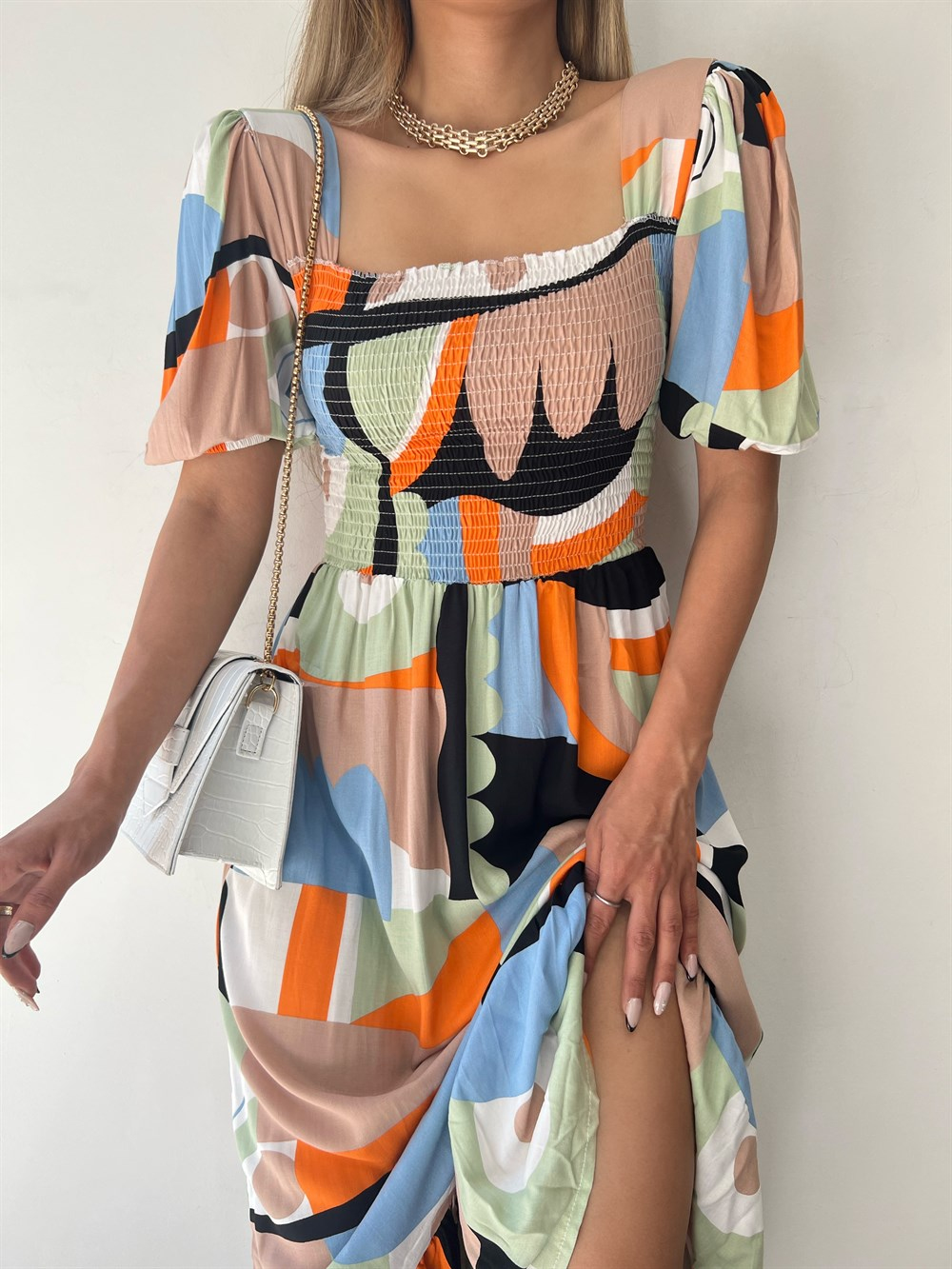Desenli Gipeli Karpuz Kol Elbise 6703 TURUNCU