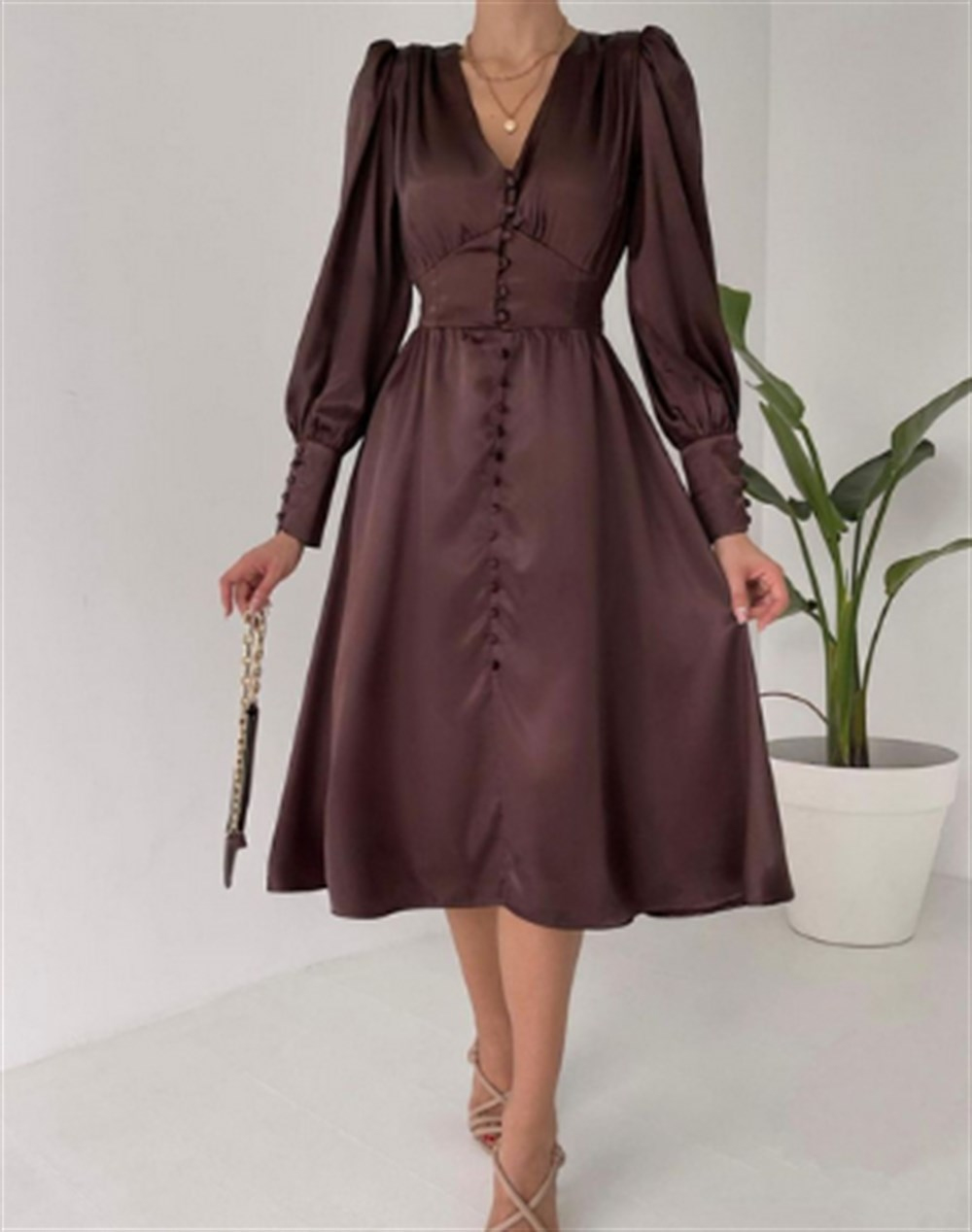 Düğme Detay Saten Elbise- 4039 KAHVERENGİ