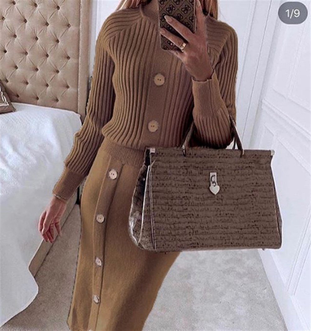 Düğmeli Etek Kazak Takım KAHVERENGİ