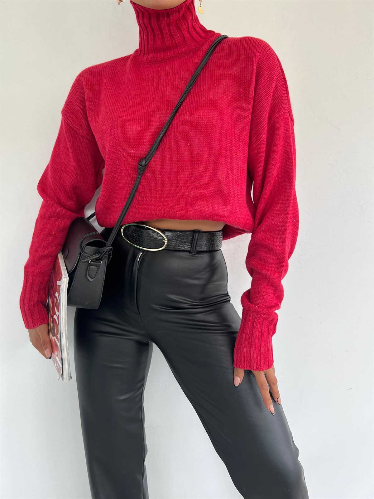 Düz Triko Boğazlı Kazak 63659 KIRMIZI