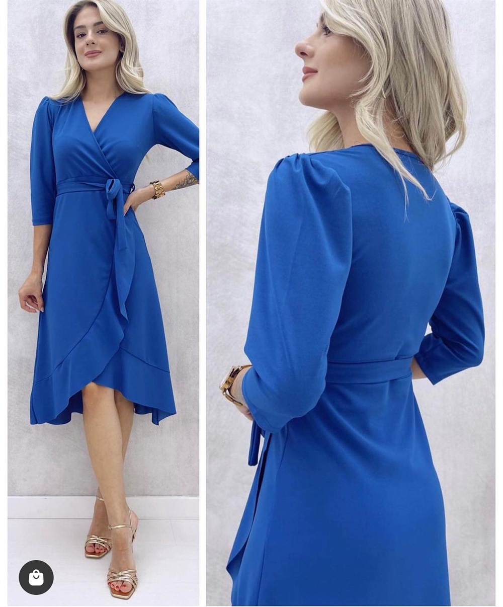 Eteği Volanlı Kuşaklı Elbise SAKS MAVİSİ
