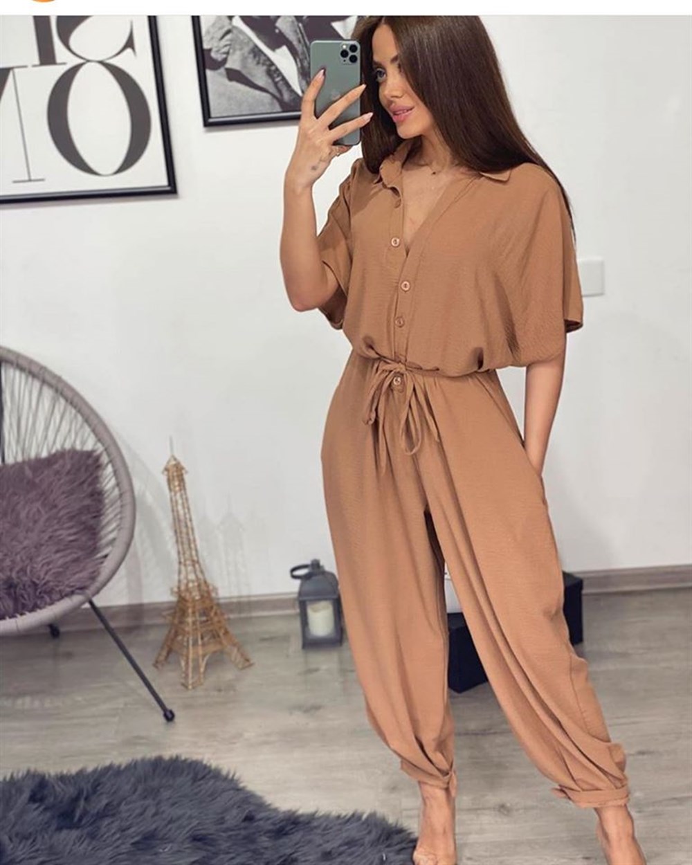 Gömlek Yaka Ön Düğmeli Tulum Kahve