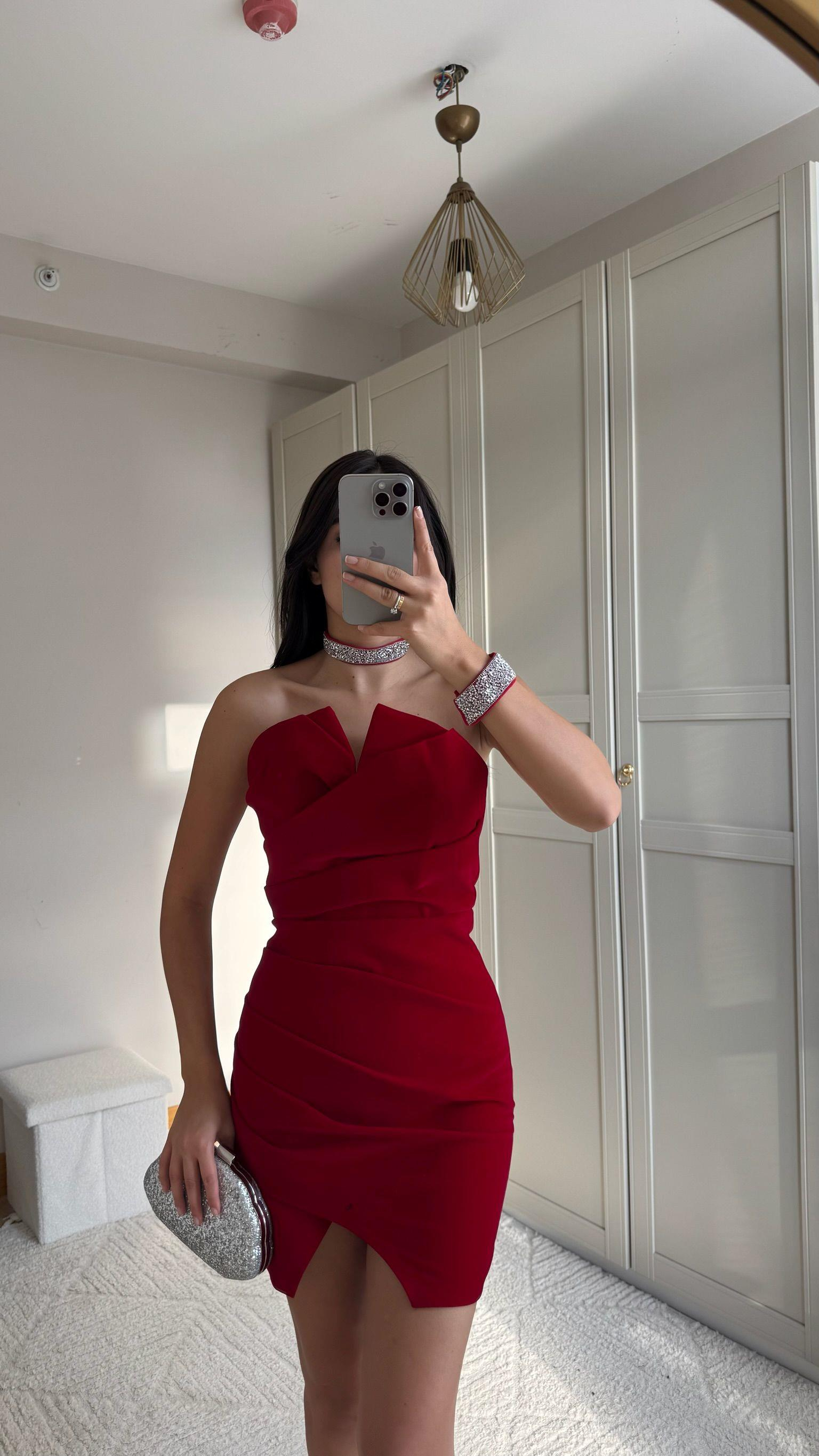 India Straplez Yaka Mini Elbise 9337 KIRMIZI
