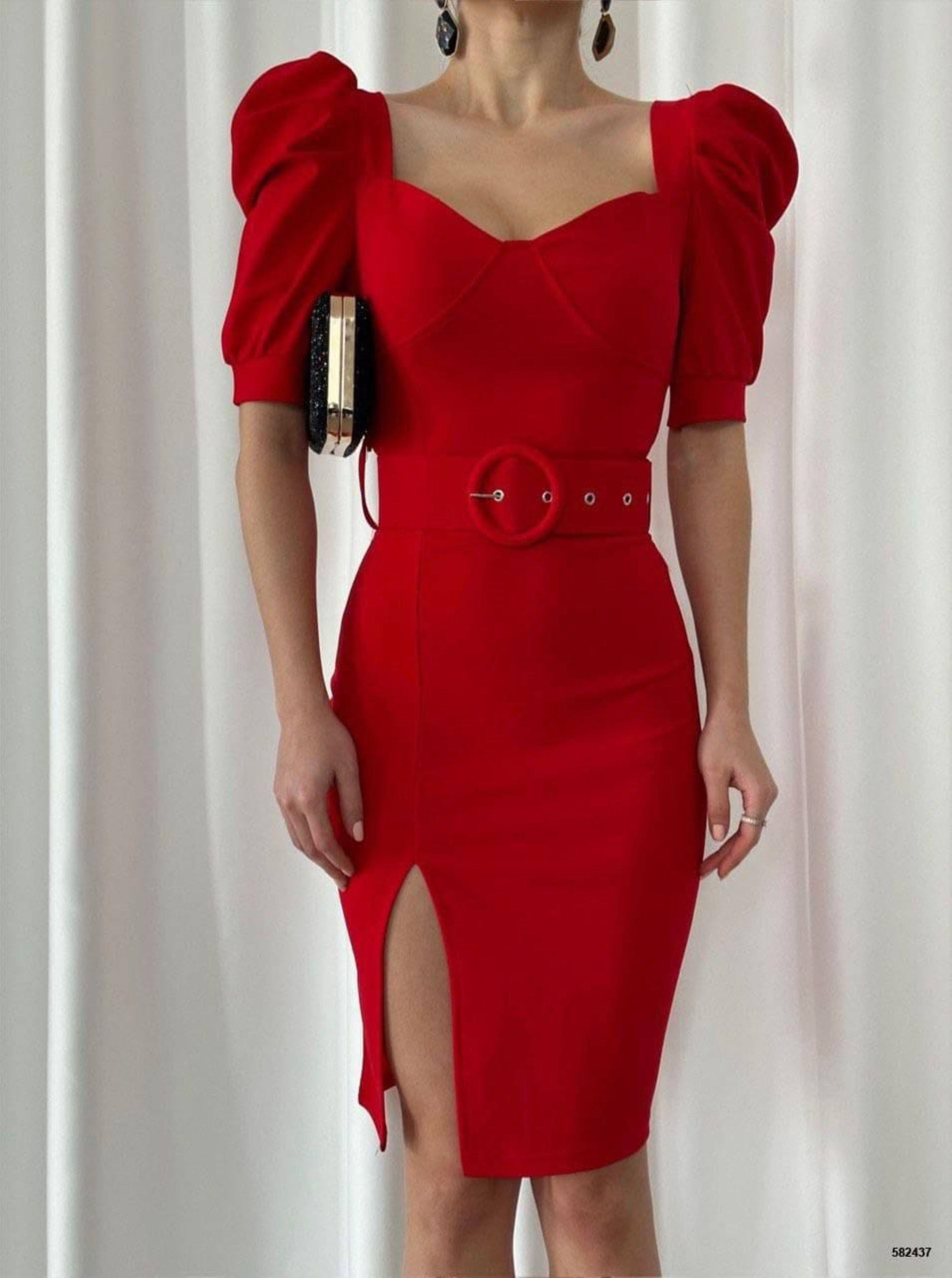 İnter Kemerli Yırtmaçlı Elbise 582437 KIRMIZI