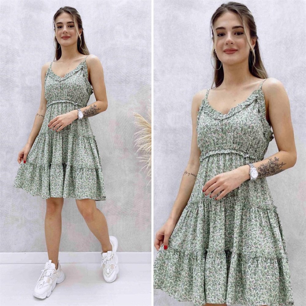 İp Askılı Çiçekli Elbise MİNT YEŞİLİ