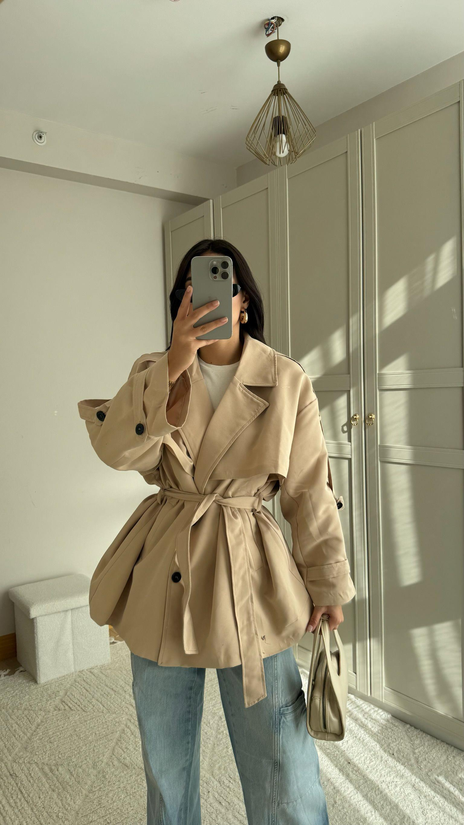 Jena Oversize Kuşaklı Düğmeli Trençkot 2635 BEJ