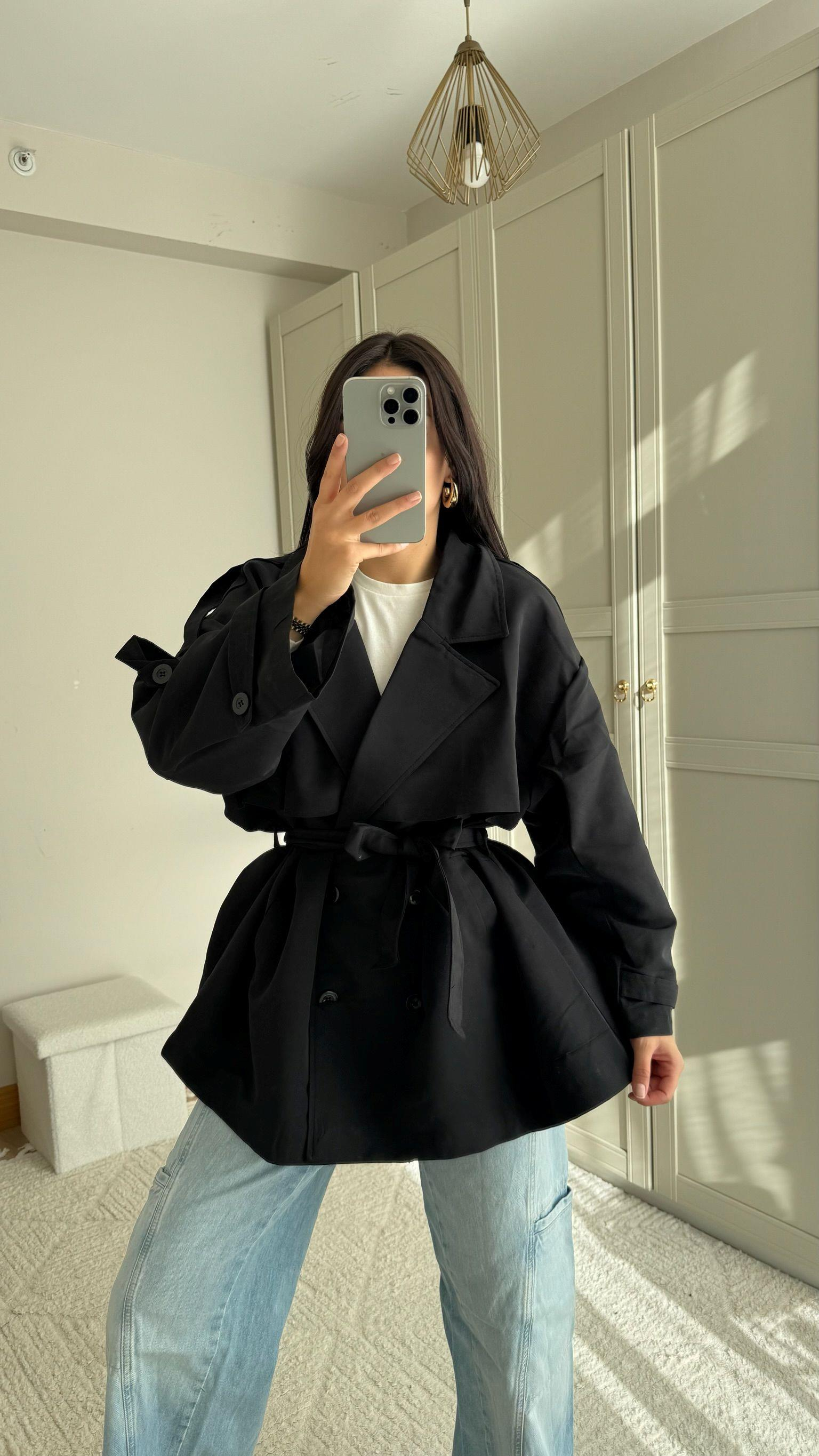 Jena Oversize Kuşaklı Düğmeli Trençkot 2635 SİYAH