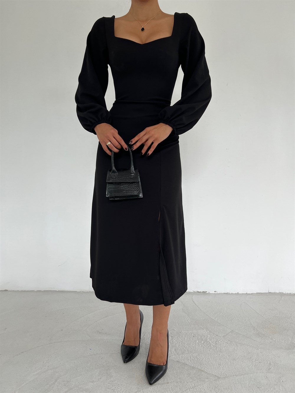 Kalp Yaka Yırtmaçlı Elbise 2849 SİYAH J6X