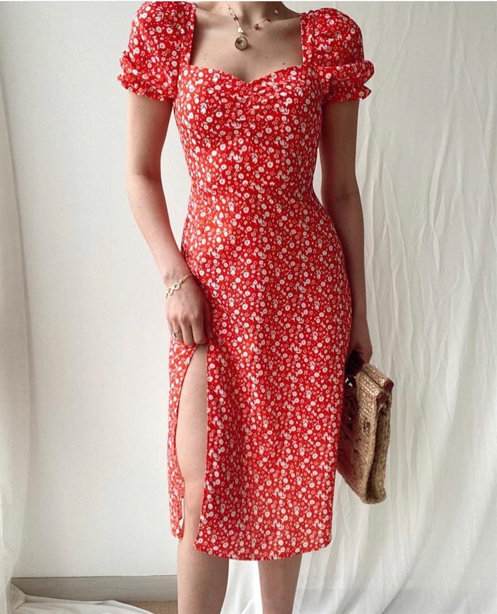 Kalp Yaka Yırtmaçlı Elbise KIRMIZI