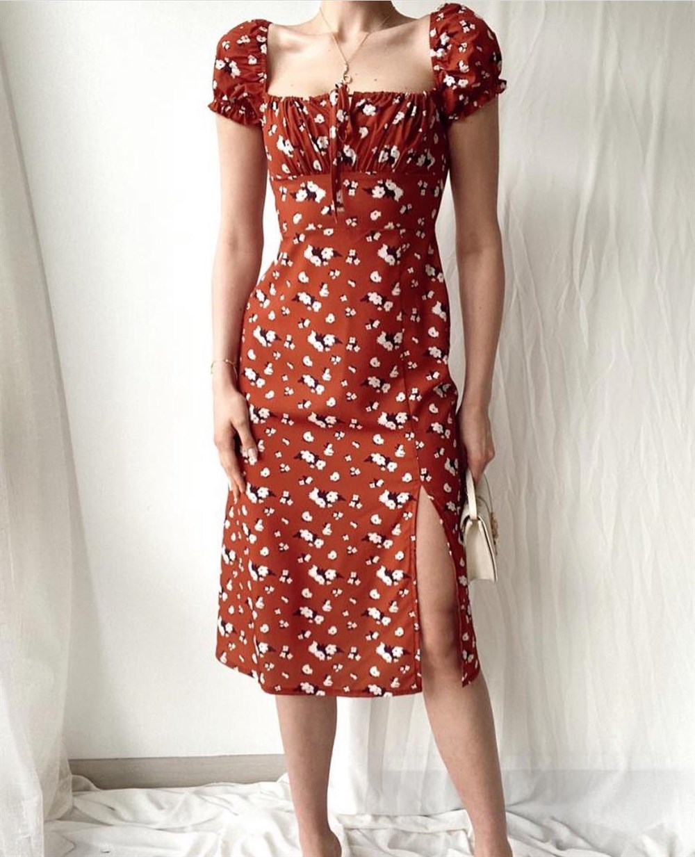 Kare Yaka Kahverengi Midi Boy Elbise KAHVERENGİ