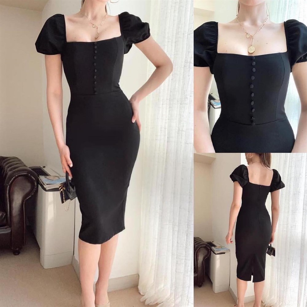Kare Yaka Ön Düğmeli Elbise SİYAH