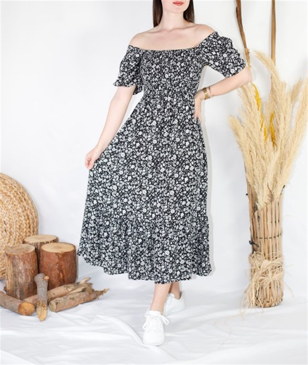 Karpuz Kol Çiçek Desen Elbise SİYAH-BEYAZ