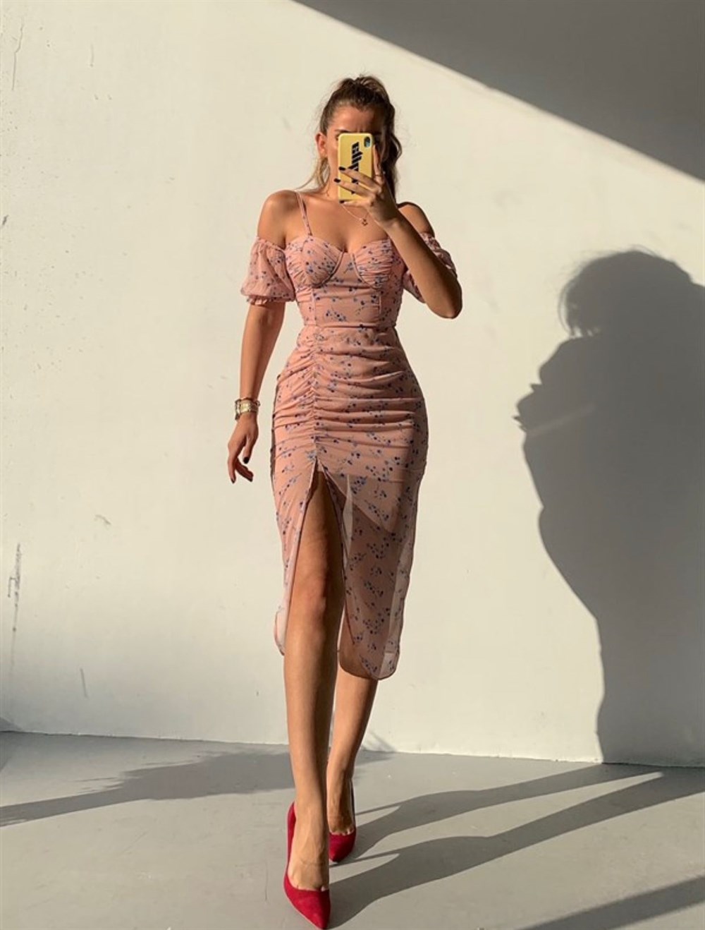 Karpuz Kol Çiçek Desen Yırtmaçlı Elbise PUDRA