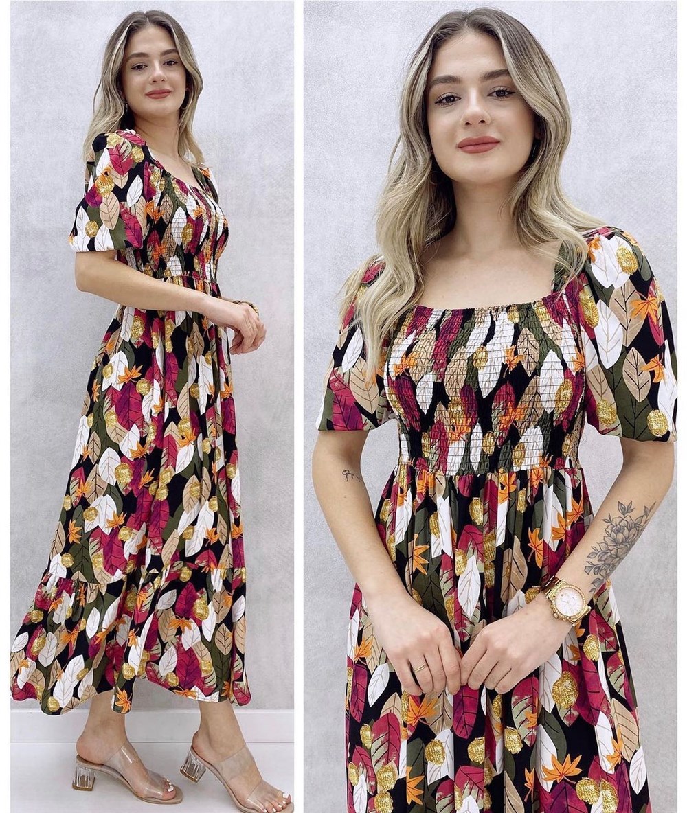 Karpuz Kol Yaprak Desen Elbise RENKLİ