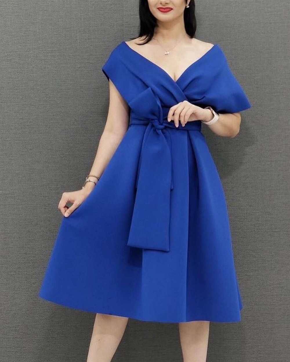 Kayık Yaka Midi Boy Elbise SAKS MAVİSİ