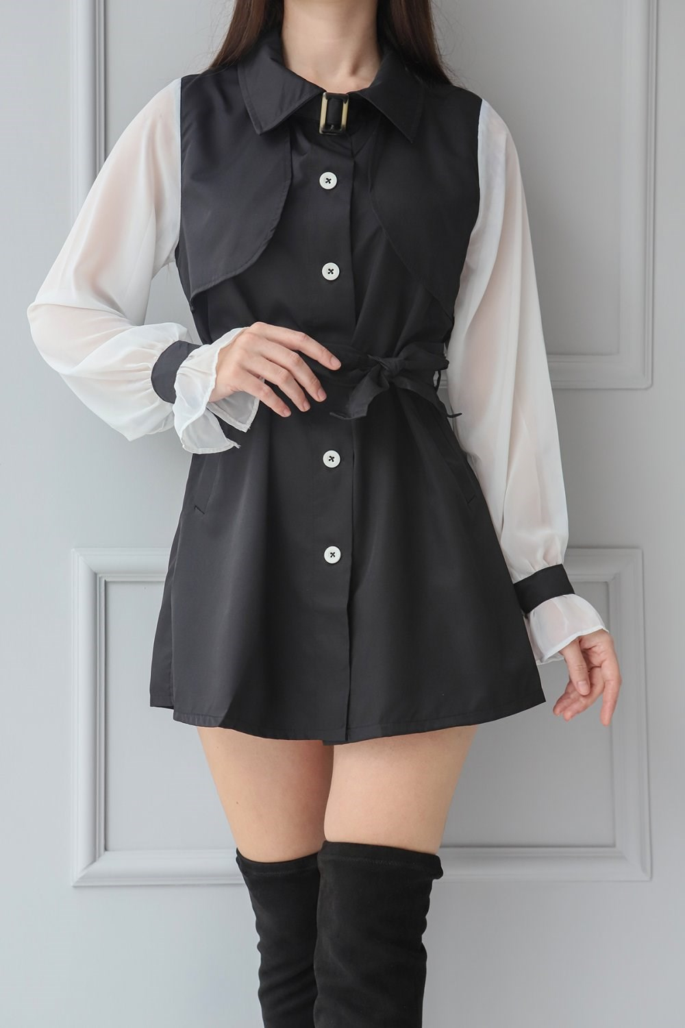 Kemerli Tül Kol Gömlek Elbise SİYAH