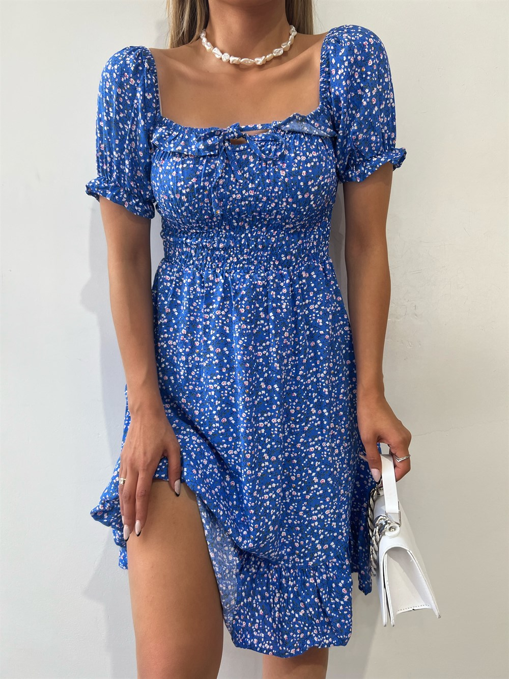 Kısa Kol Gipeli Desenli Elbise 2549 MAVİ