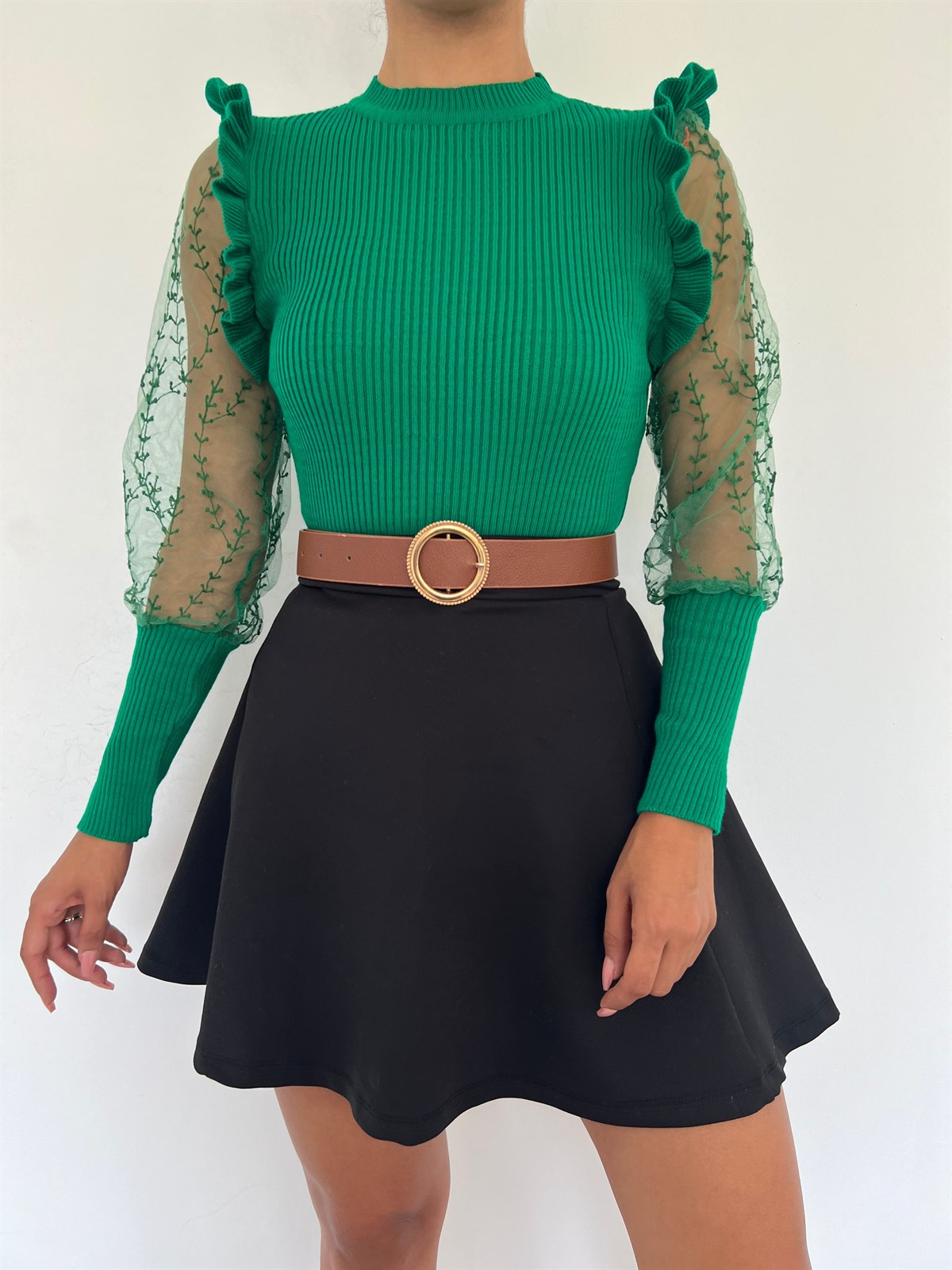 Kol Tasarım Omuz Volanlı Kazak 5666 YEŞİL