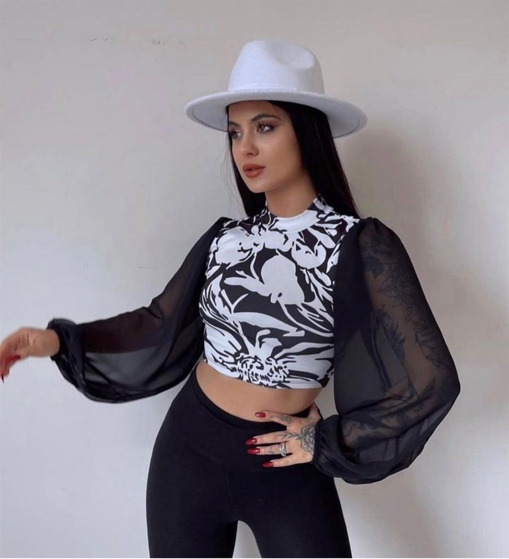 Kolları Tül Digital Baskı Dalgıç Crop - 9023 BEYAZ