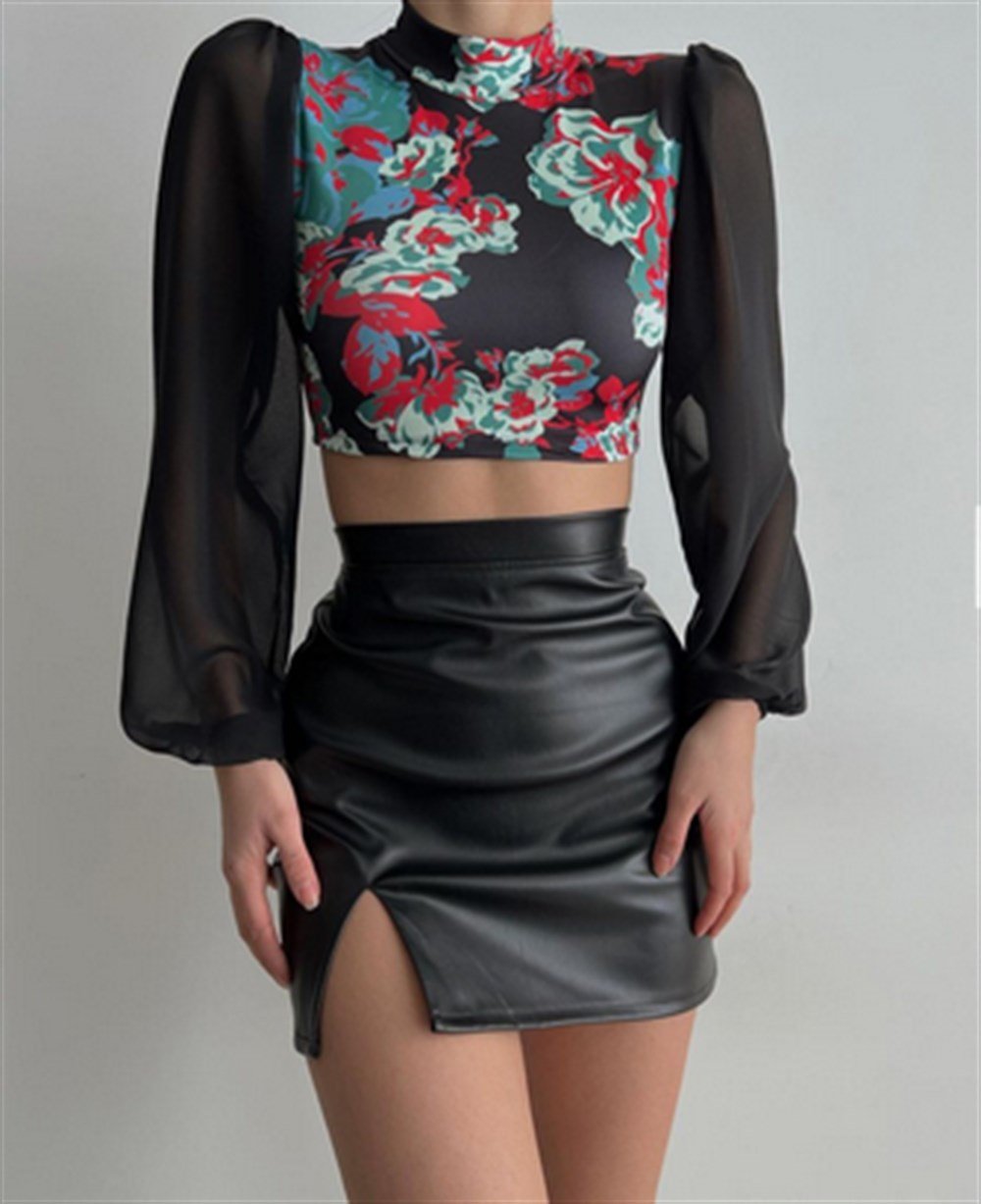 Kolları Tül Digital Baskı Dalgıç Crop - 9023 YEŞİL