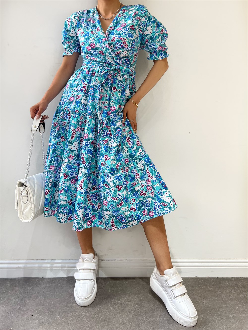 Kruvaze Vatkalı Kuşaklı Elbise 2896 TURKUAZ