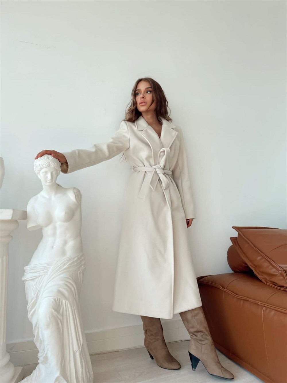 Kuşaklı Midi Boy Astarlı Yün Karışımlı Kaşe Kaban BEYAZ