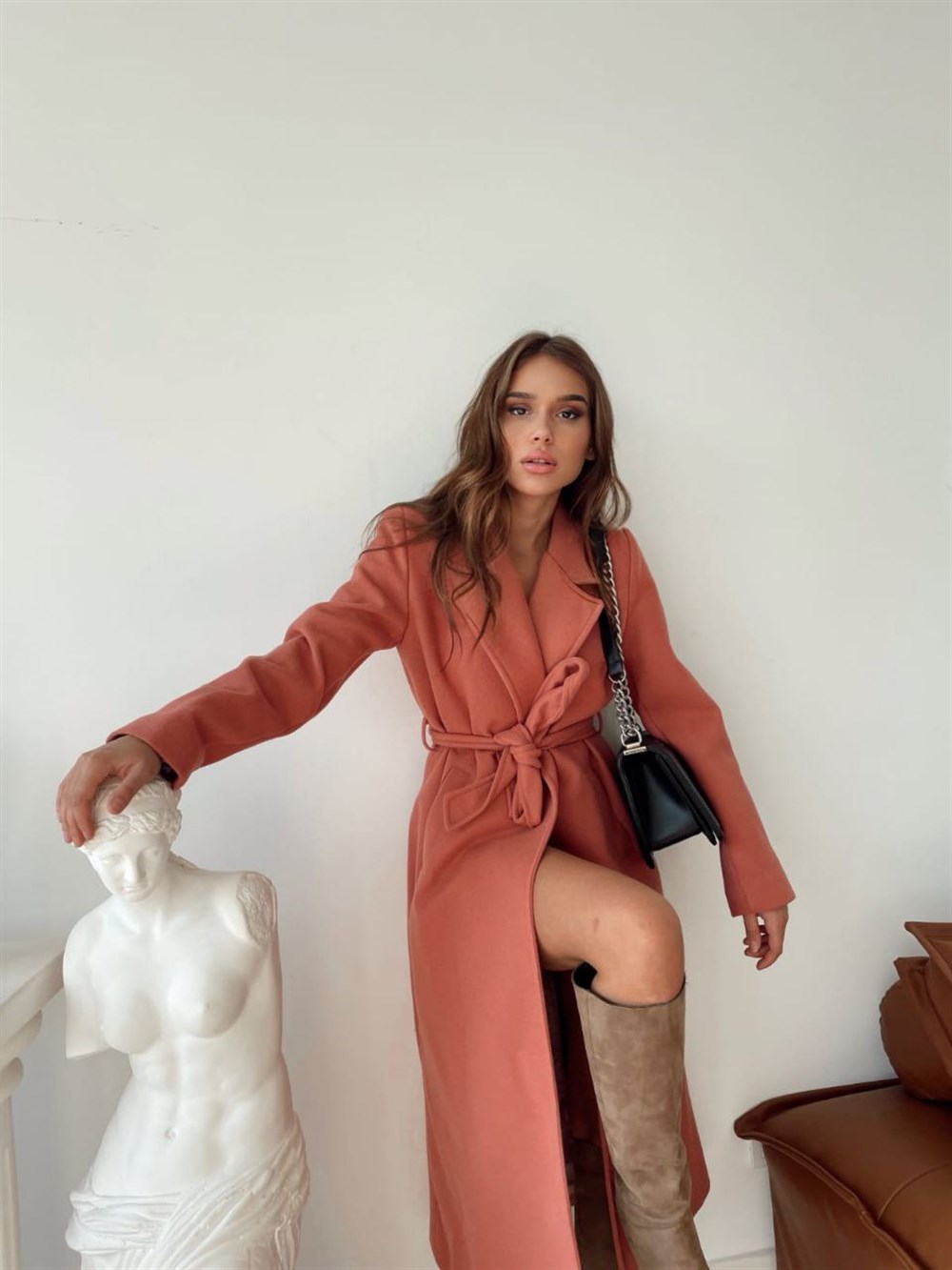 Kuşaklı Midi Boy Astarlı Yün Karışımlı Kaşe Kaban KİREMİT