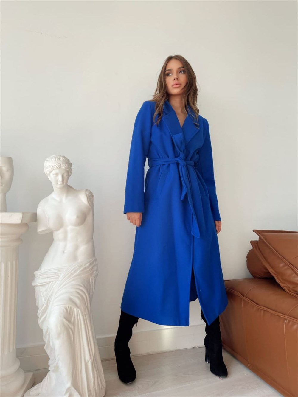 Kuşaklı Midi Boy Astarlı Yün Karışımlı Kaşe Kaban SAKS MAVİSİ