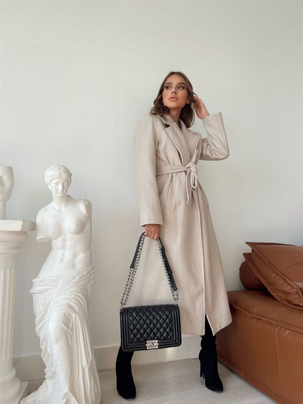 Kuşaklı Midi Boy Astarlı Yün Karışımlı Kaşe Kaban TAŞ