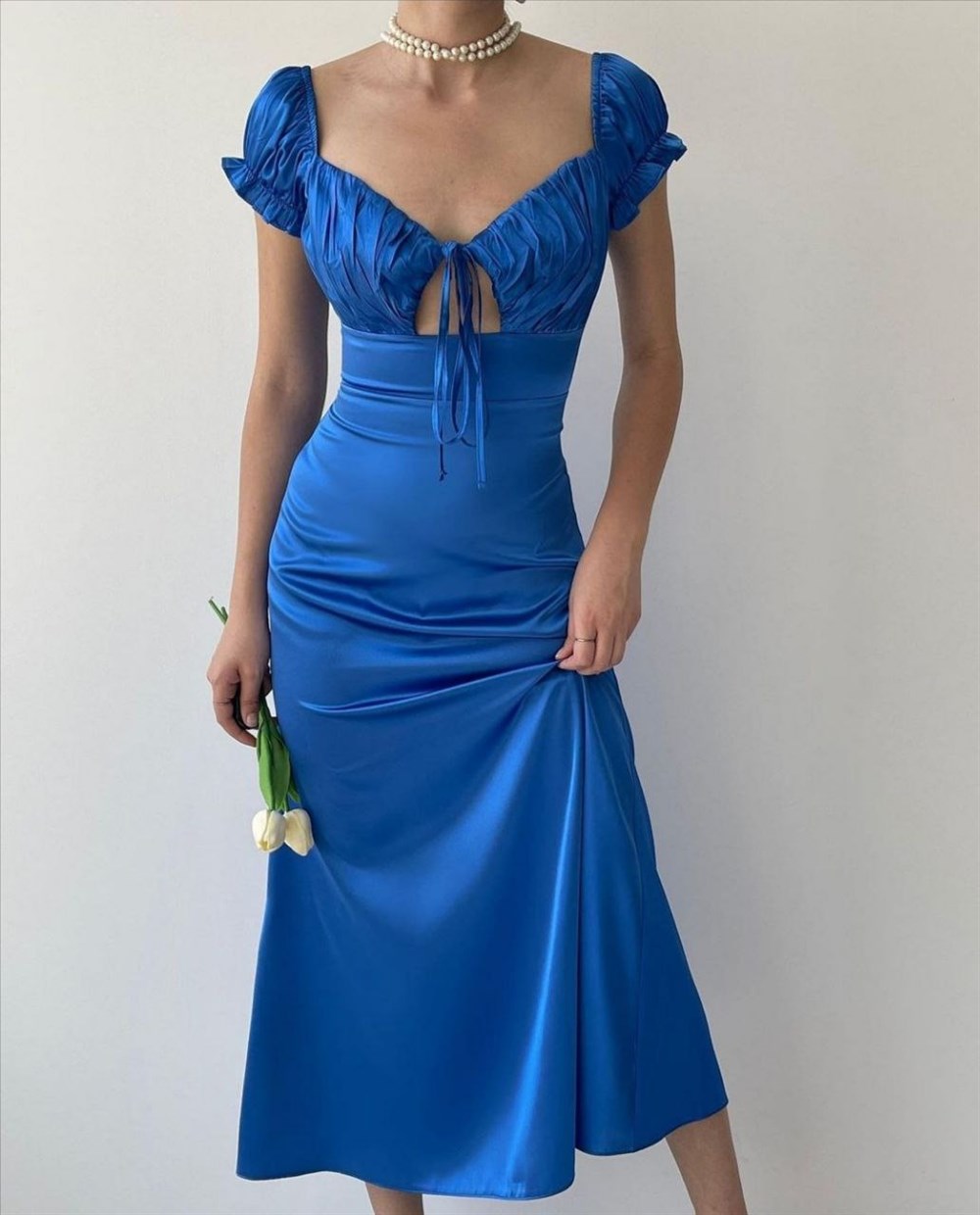 Ön Bağlamalı Uzun Saten Elbise 4175 SAKS MAVİSİ
