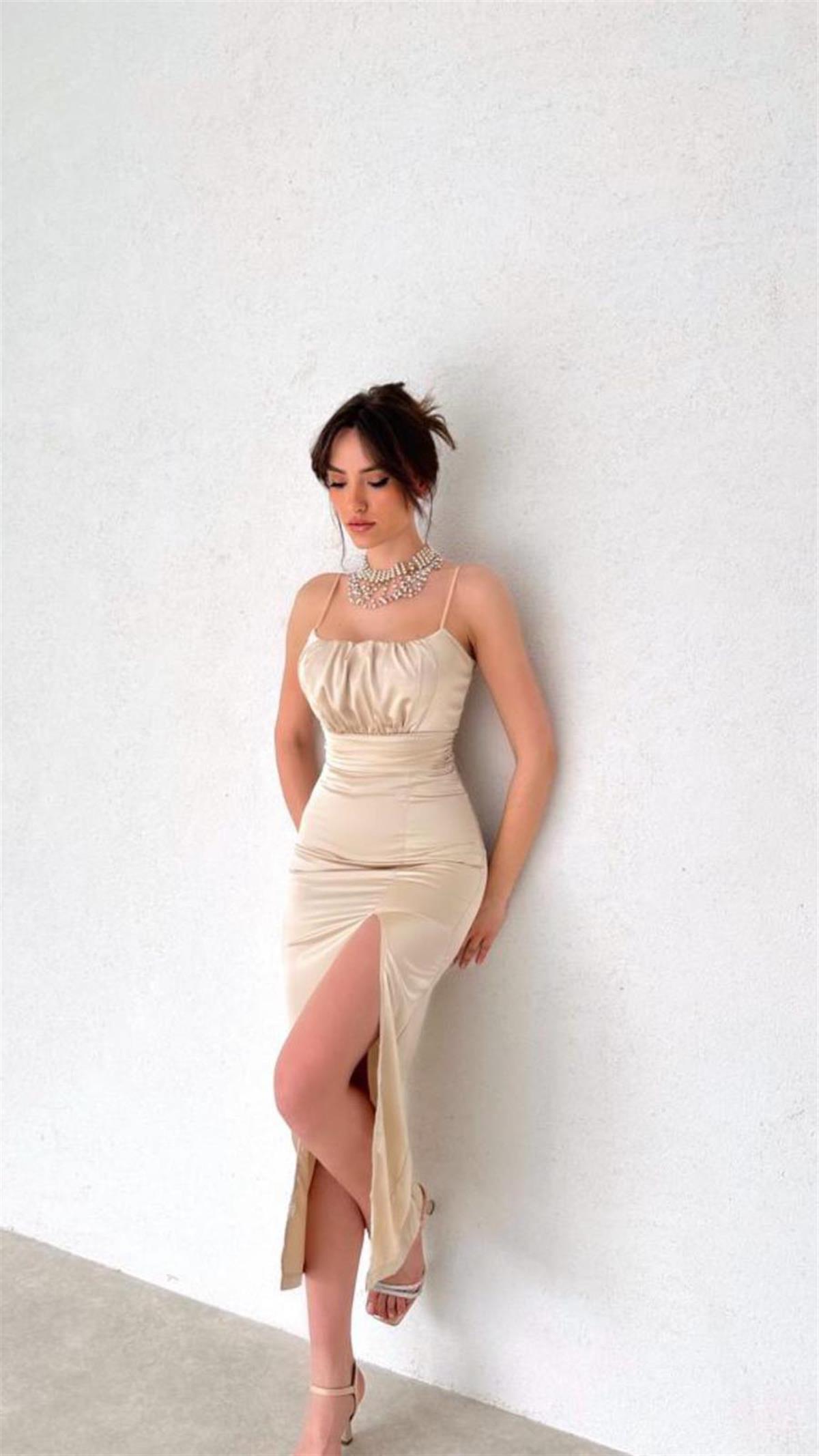 Ön Drapeli Yırtmaçlı Saten Elbise 2604 KREM