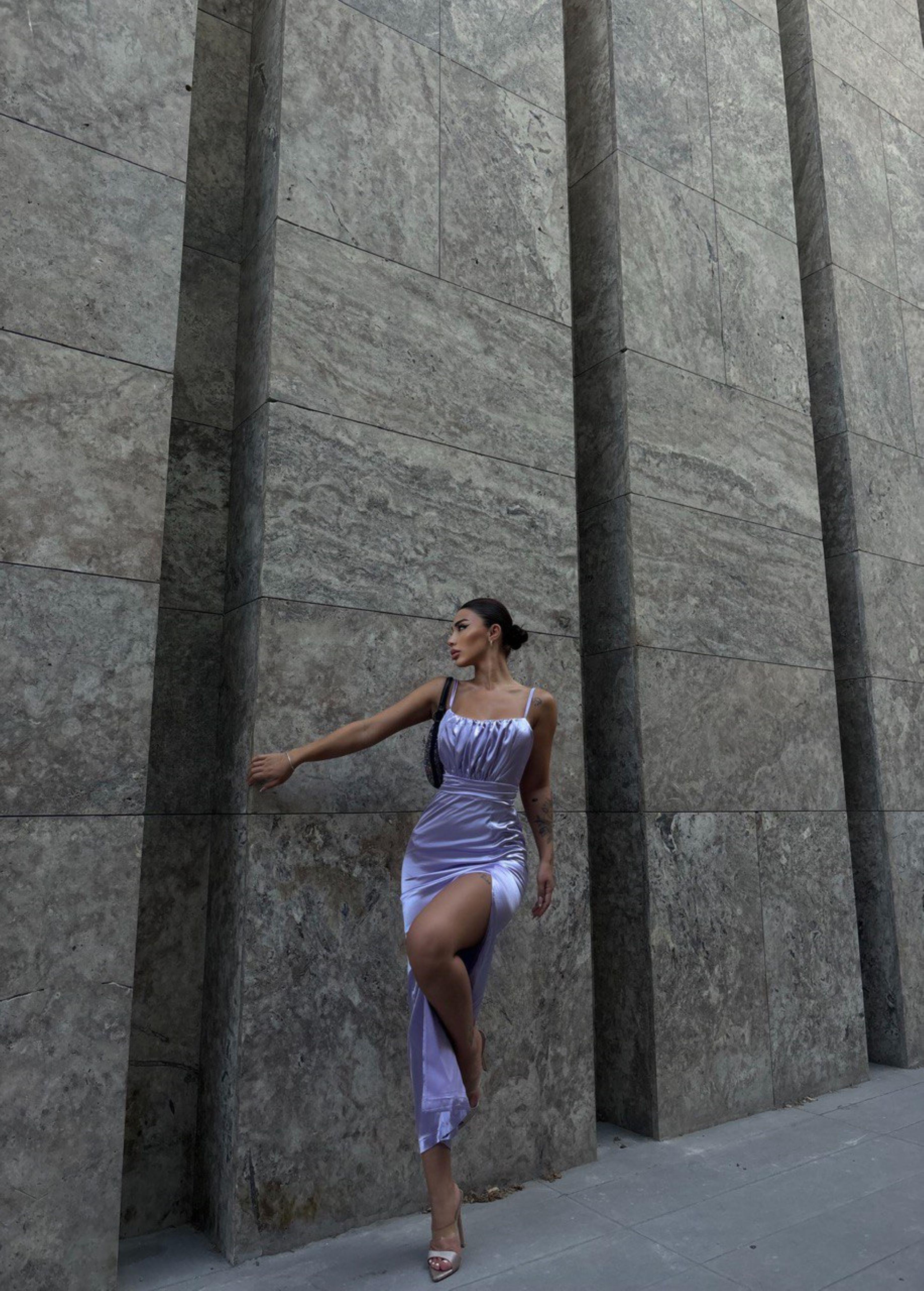 Ön Drapeli Yırtmaçlı Saten Elbise 2604 LİLA