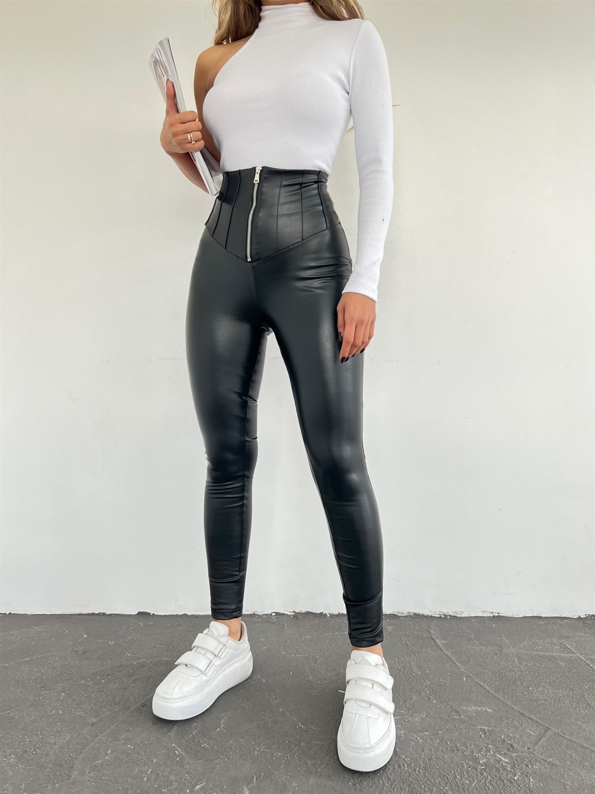 Ön Fermuarlı Deri Tayt 4145 Siyah